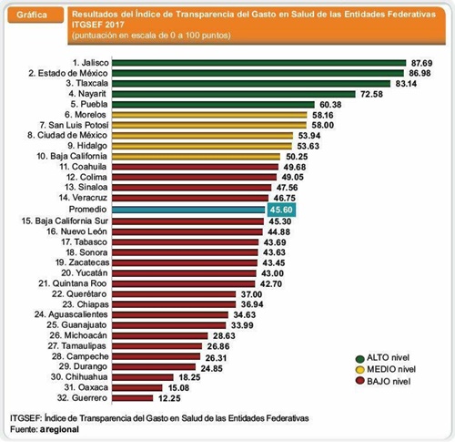 La firma de consultoría A Regional calificó a Nayarit en el cuarto lugar a nivel nacional (con un 72.58) en el tema de la información disponible sobre el ejercicio del gasto público en el sector salud, sólo por debajo de Jalisco, Estado de México y Tlaxcala.