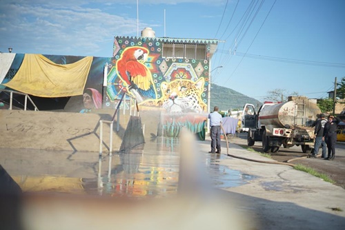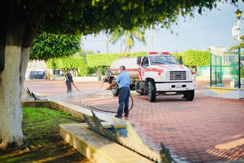 Por esto el personal de Protección Ciudadana y Bomberos, realizan la desinfección y limpieza con una aplicación de agua con producto químico y desinfectante en mobiliario urbano y áreas públicas, con la finalidad de contener y minimizar los contagios en la zona.