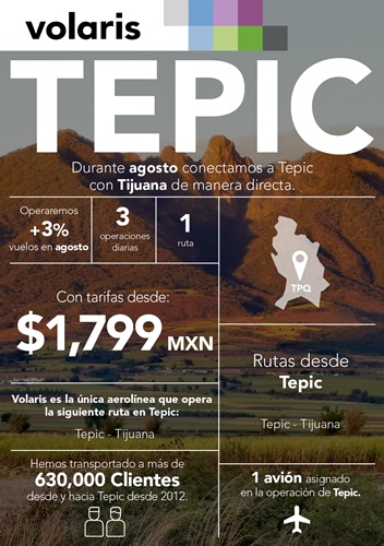 Volaris opera en Nayarit desde el 2012 y desde entonces ha transportado a 630 mil personas desde y hacia la ciudad de Tepic y es la única aerolínea en operarla. Durante agosto llevará a cabo un total de 80 vuelos, cumpliendo con su promesa de lograr que más personas viajen tranquilos gracias a su Protocolo de Bioseguridad, que brinda bienestar a sus Clientes en todas las etapas del viaje, y a su red de conexiones punto a punto, la más grande México.