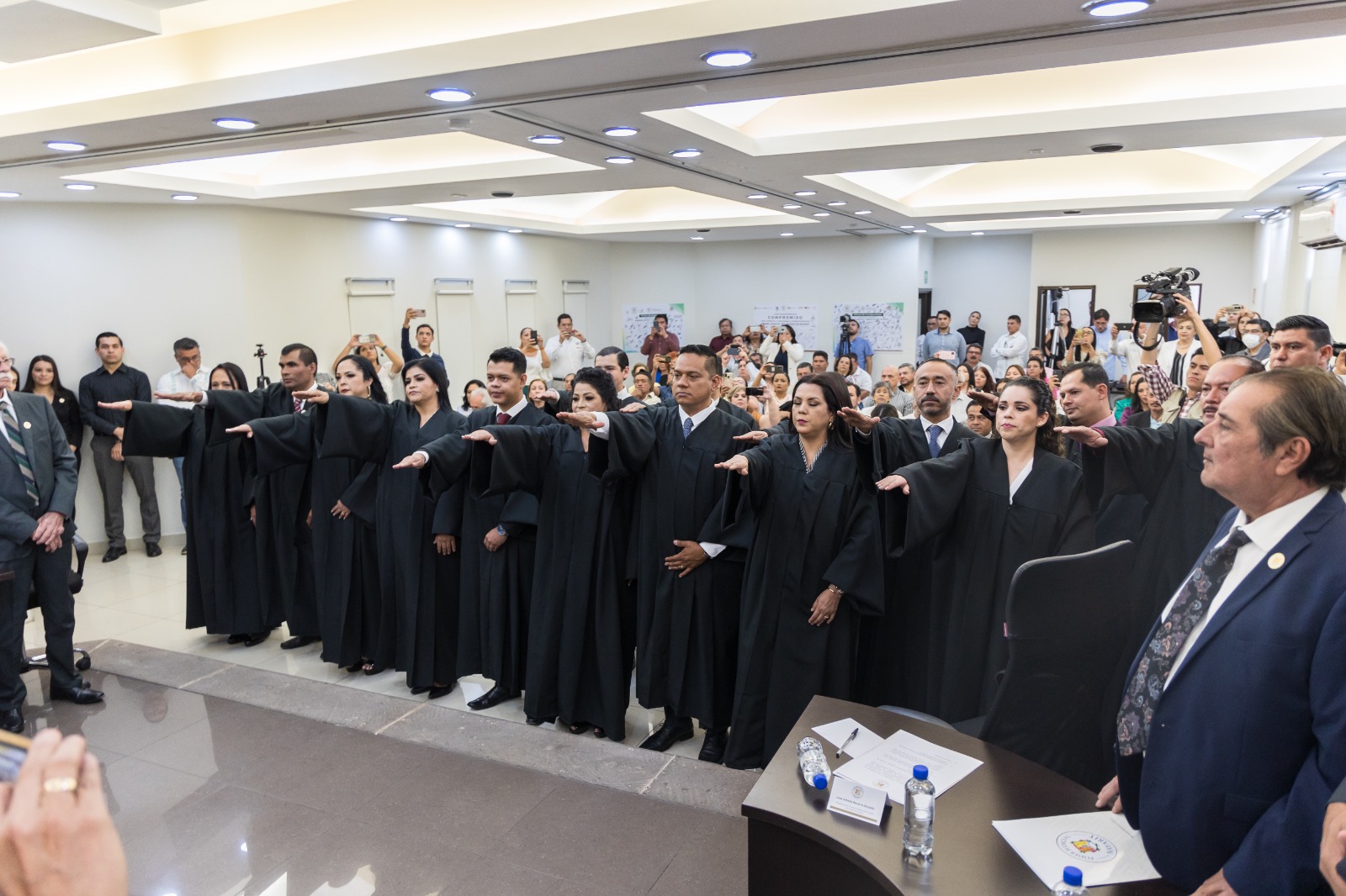 En sesión conjunta de Plenos, con el Gobernador como invitado; sobre los concursos, el mandatario aplaudió que la justicia llegue a quien hace justicia. La Magistrada Presidenta reconoció el respaldo del Ejecutivo al fortalecimiento del Poder Judicial y exhortó a las personas designadas a defender con valentía el estado de Derecho.