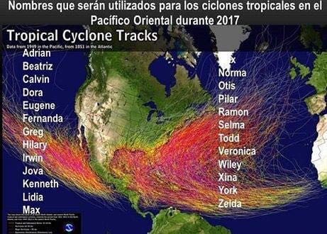 Los ciclones llevarán como nombres: Adrián, Beatriz, Calvin, Dora, Eugene, Fernanda, Creg, Hilary, Irwin, Jova, Kenneth, Lidia, Max, Norma, Otis, Pilar, Ramón, Selma, Todd, Verónica, Wiley, Xina, York y Zelda