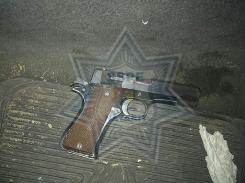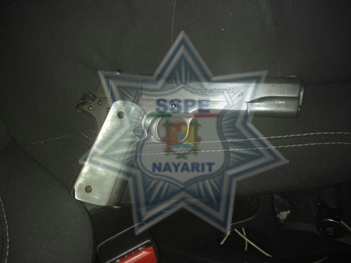 En el vehículo se encontraron dos armas de fuego, una calibre 38 súper y una 9 milímetros, de uso exclusivo del Ejército Mexicano. Así mismo, en el interior del vehículo se encontraba Luis N. N., de 29 años de edad, originario de Villa Hidalgo, Nayarit, y vecino de esta ciudad, el cual había sido privado de su libertad minutos antes por los mismos presuntos delincuentes.