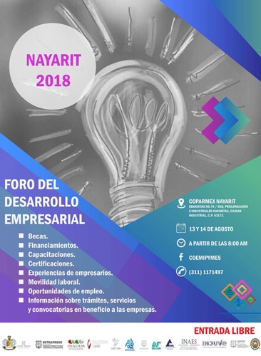 Por esta razón se realizará el “Foro Estatal de Desarrollo Empresarial, Nayarit 2018” este 13 y 14 de agosto, en las instalaciones de COPARMEX, ubicada en la calle Ebanistas No 74, entre Esquina Prolongación e Industriales Nayaritas, Ciudad Industrial,en esta capital nayarita;en donde se informarán los detalles trámites, financiamientos; habrá acciones de capacitaciones; conferencias de experiencias de empresarios, entre otros temas.