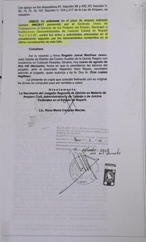 De acuerdo a la información vertida por el Frente Autentico de Sindicatos Unidos que aglutina a los sindicatos SUTSEN, SITRAPEN, Sindicato Unido del Poder Judicial, SITEM, SITTP y SET DIF, señalaron, que el día de hoy hacían un señalamiento de una mala acción hecha e impulsada por la dirigencia sindical del SUTSEM, esto bajo el expediente 596/2017, cuyo amparo ganado beneficia a los sindicatos ya mencionados, después de un año y medio de litigio.