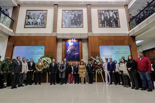 Los tres poderes del estado e invitados especiales hicieron guardia de honor y colocaron una ofrenda floral ante la imagen de Venustiano Carranza Garza, en el patio central que lleva su nombre.